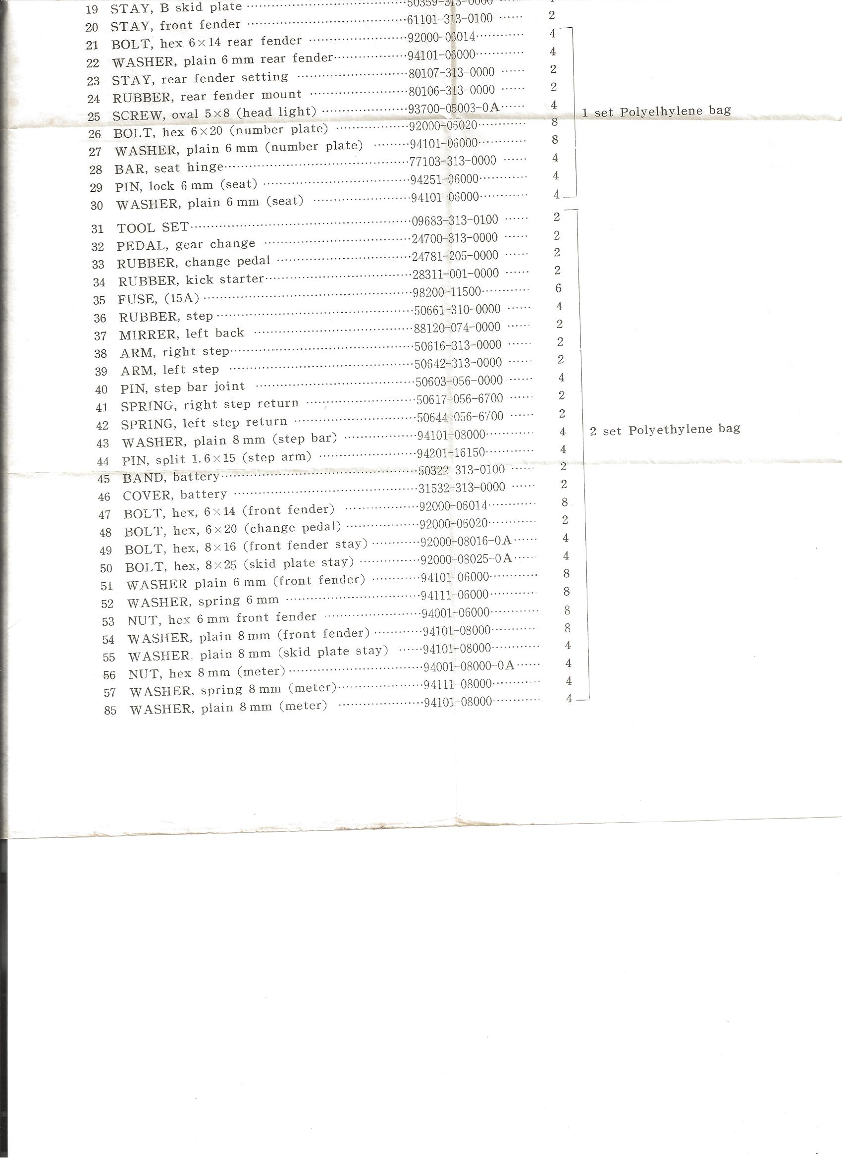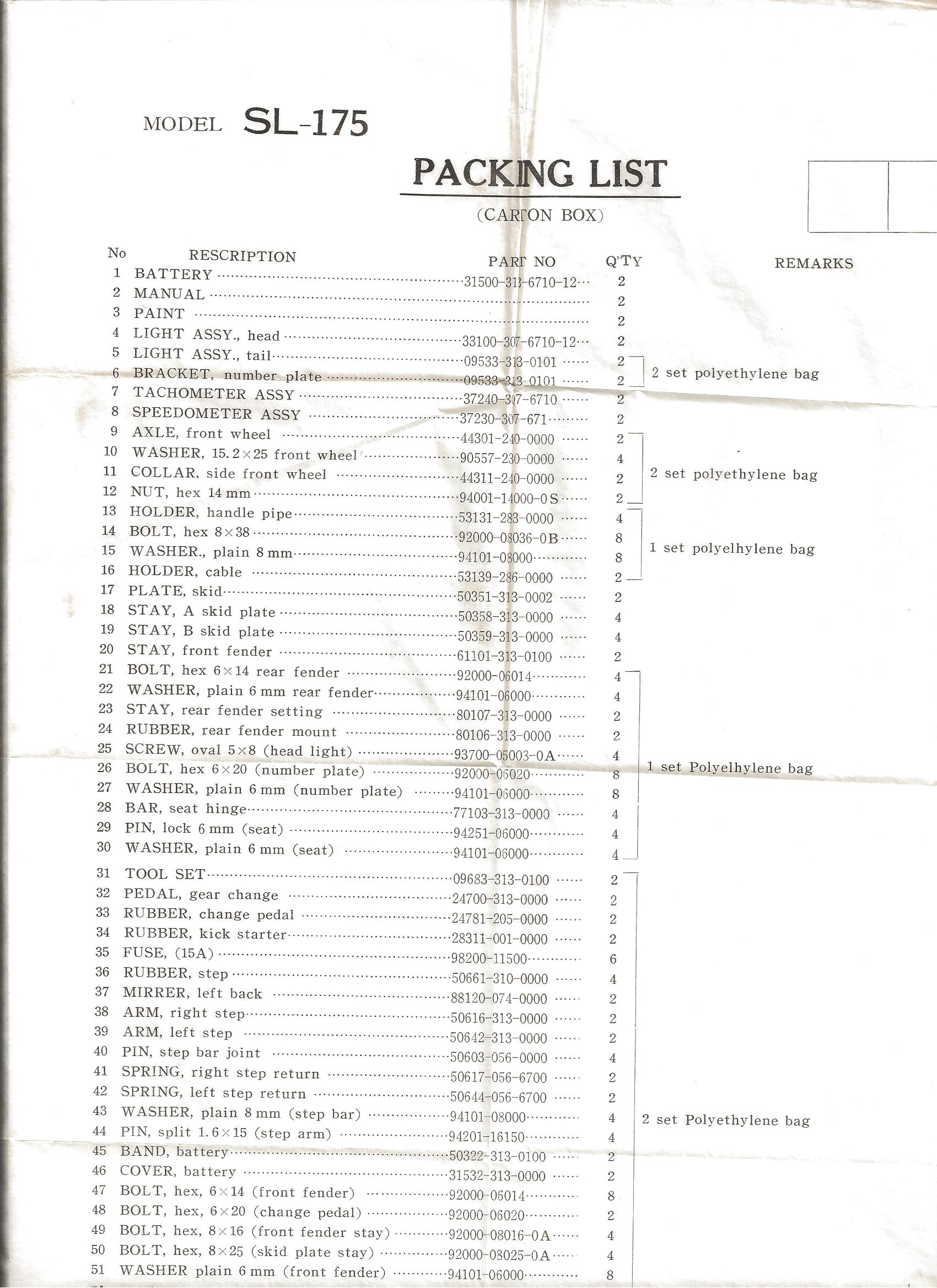 Honda Dealer SL175 Packing List. This is what